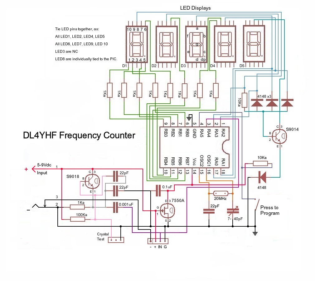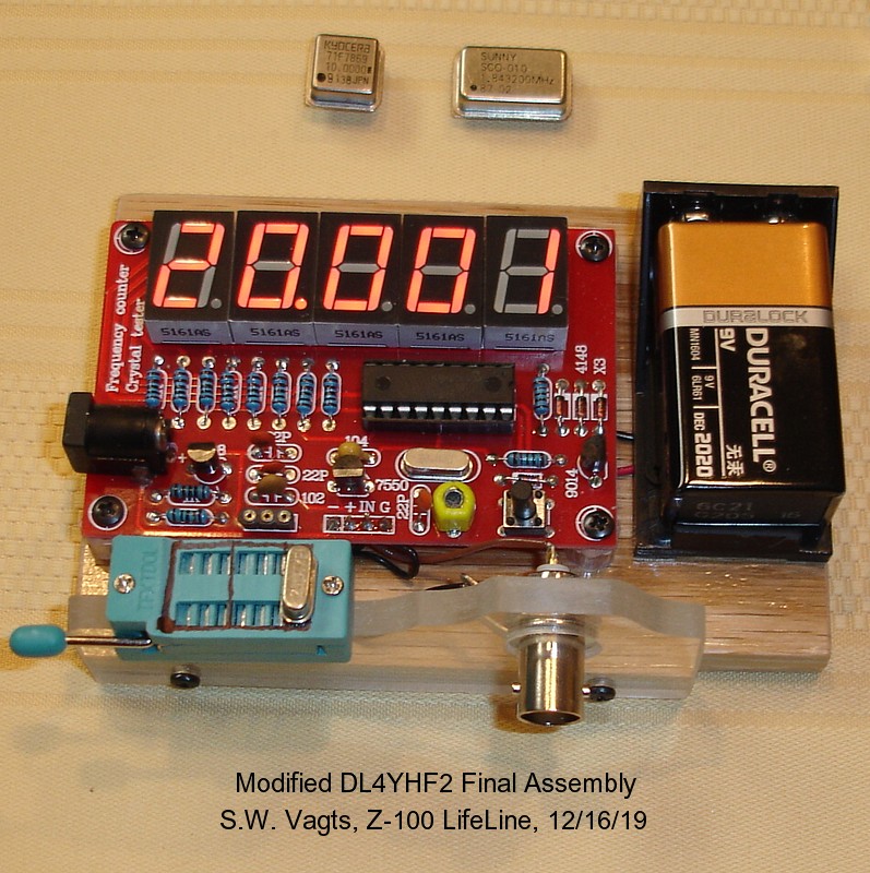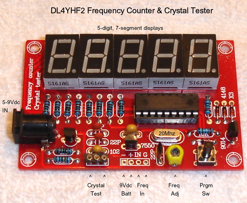 DL4YHF2 Frequency Counter & Crystal Tester Manual: The DL4YHF Frequency Counter & Crystal Tester is sold as a kit and requires some experience in soldering skills. A soldering iron with a needle point tip would be very helpful here. The kit comes with NO instructions, but I found everything on the internet. I have assembled the kit, created a schematic, added the ability to check 4-pin crystal oscillators, and included everything in my manual. This is a five-digit frequency counter kit based on a PIC single chip 16F628 micro-controller, with a crystal oscillator measurement function, programmable frequency setting, and LED digital display. It is most commonly used to measure the oscillation frequency of a crystal. The Part/Model Number can be found as YS9283, B8O8, and many others, but it is actually a generic, unbranded circuit board based on a circuit developed by Wolfgang Buscher, DL4YHF. All the parts are through hole components, so the kit is easy, and simple to operate. Documentation is here: DL4YHF2 Frequency Counter & Crystal Tester Manual.