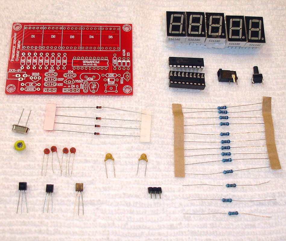 Note: The kit does NOT include the plastic piece, ZIF socket, BNC connector, or the crystal oscillators shown in the picture. For that matter, they are not actually needed. Instead of the ZIF socket, you could just as easily add a normal 14-pin IC socket - I show one in the documentation. I added the ability to test the 4-pin crystal oscillator, so I will call the modified device the DL4YHF2 Frequency Counter and Crystal Tester.
