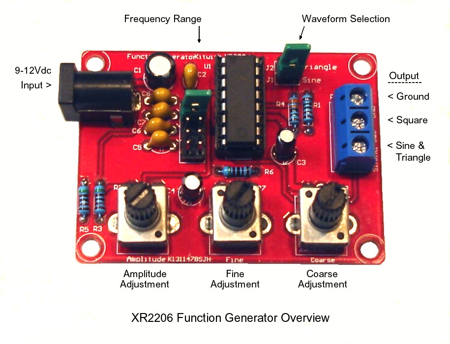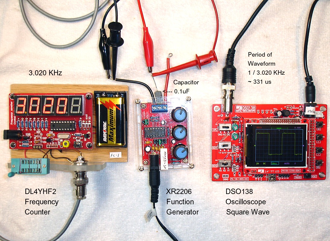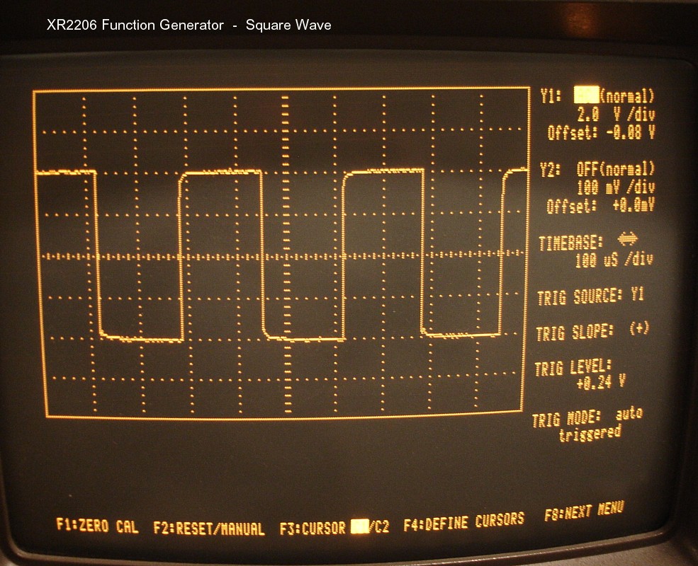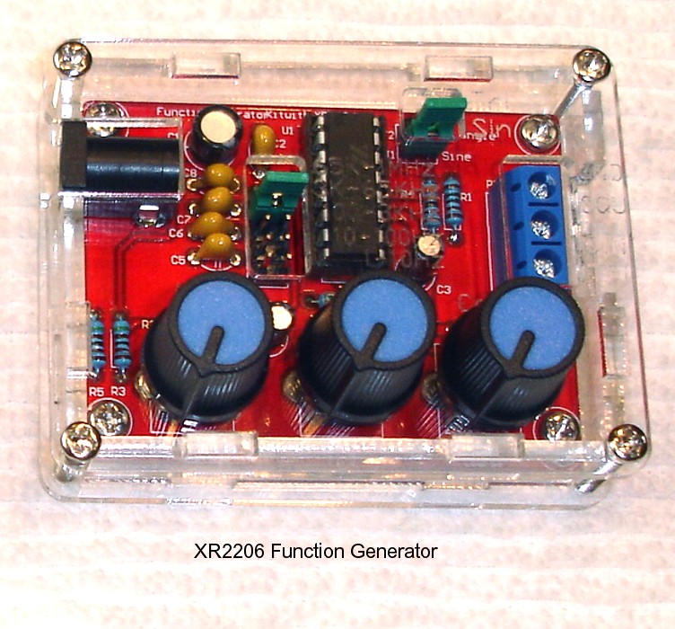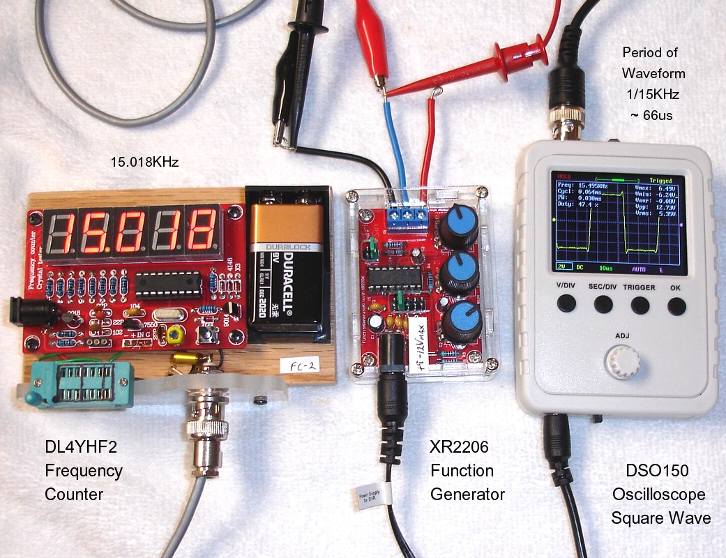 XR2206 Function Generator: The XR2206 Function Generator is sold as a simple, beginner's kit from China that does not require a lot of soldering skills, but becomes a great addition to our assortment of electronics tools. It can generate three types of stable wave forms (sine, triangular, and square wave) with a frequency range from 1Hz to 1MHz and an adjustable amplitude. The last photo shows the square wave on my Z-100 Heath Digital Scope. Notice the leading edge of the waveform is slightly rounded, which I suspect is from the capacitance of the long input cable. Using a short cable on the DSO138 oscilloscope described next, the waveform was excellent and stable. This Function Generator requires a 9-12Vdc AC/DC power adapter, not provided. Documentation is here: XR2206 Function Generator Assembly and Operations Manual.