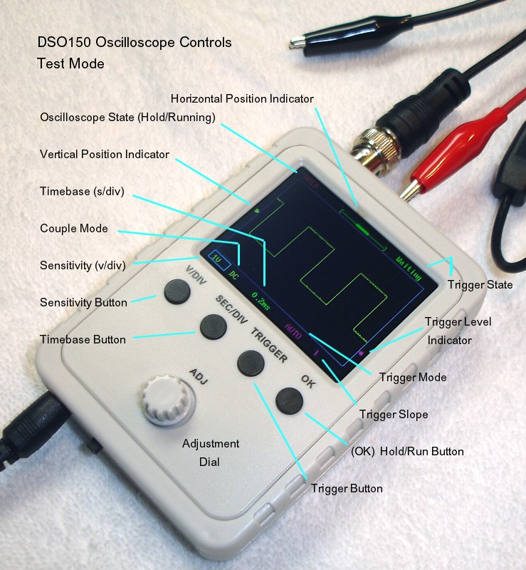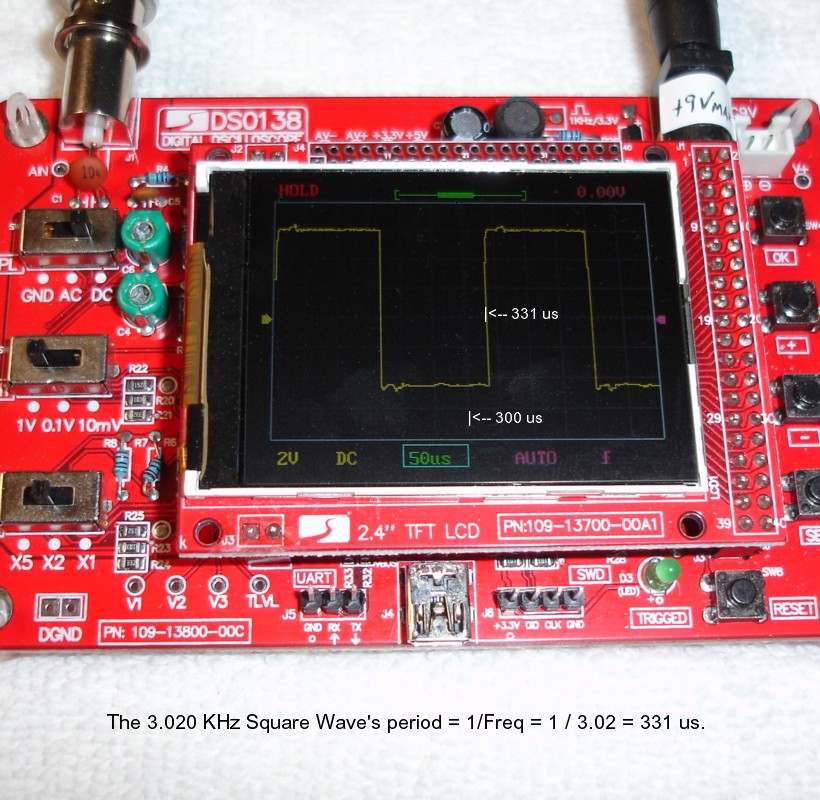 DSO138 Oscilloscope: The DSO138 Oscilloscope is an inexpensive low-speed miniature oscilloscope with 2.4" LCD display. Based on the STM32F103 MCU, it was developed by JYE Tech, but it has been cloned and is distributed by a few other manufacturers. It is sold as a kit, or already assembled for nearly the same price, about $20.00 on Amazon.com. Designed as a training oscilloscope, the DSO138 contains only the basic oscilloscope functions with no fancy features. The heart of the DSO138 is a Cortex-M3 ARM processor (STM32F103C8). It uses a 2.4" TFT LCD (320 X 240 dot matrix, 262K colors) that displays crisp and clear waveforms. Simplicity in structure and easiness in assembly and operation are the main highlights of the design. For these purposes, DSO138 uses mostly through-hole parts, and the kit can be purchased with the surface mount parts already installed. The MCU for both configurations has already been pre-programmed and no reprogramming is required. Documentation is here: DSO138 Oscilloscope Manual. Also, please read the supplement to this manual, Oscilloscope Sampling Rate.