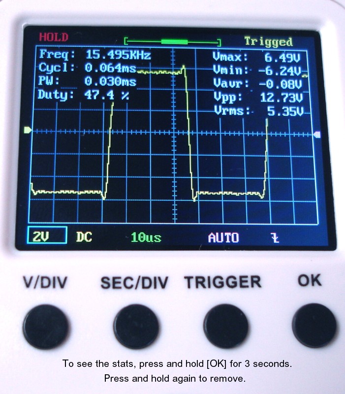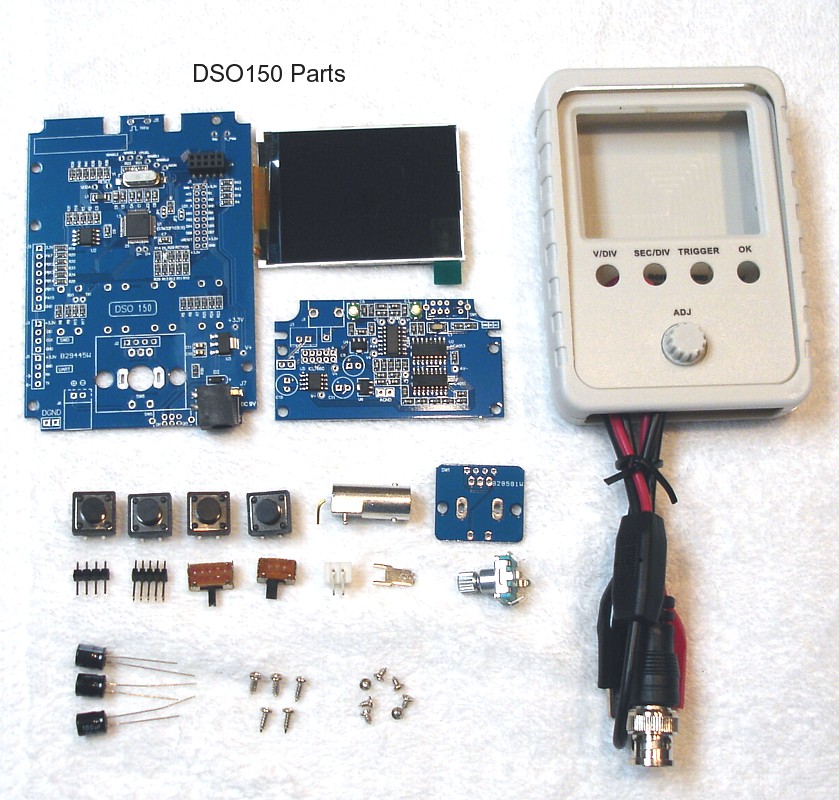 DSO150 Oscilloscope: The DSO150 Oscilloscope is a more capable brother to the DSO138 discussed above. It is another inexpensive low-speed miniature oscilloscope with 2.4" color TFT LCD (320 x 240 dot matrix, 262K color display. Based on the ARM Cortex-M3 processor (STM32F103C8), it was developed by JYE Tech, China. It is sold as a full kit, or a partial kit with all the surface mounted parts already installed on the boards, leaving just a few parts remaining. Designed as a training oscilloscope, the DSO150 contains only the basic oscilloscope functions with no fancy features, but it can save and recall a waveform and calculate the relevent measurements of the waveform and display them at the press of a button (see last picture) . Simplicity in structure and easiness in assembly and operation are the main highlights of the design. The MCU has already been pre-programmed and no reprogramming is required. Documentation is here: DSO150 Oscilloscope Manual. Also, please read the supplement to this manual, Oscilloscope Sampling Rate.