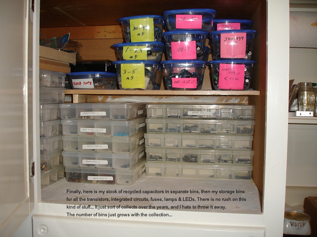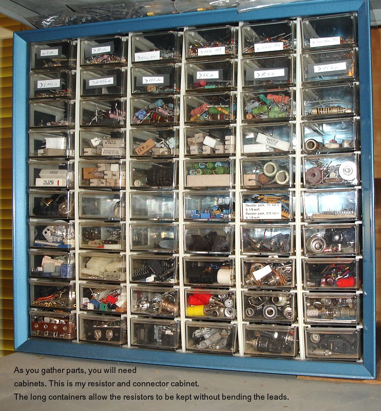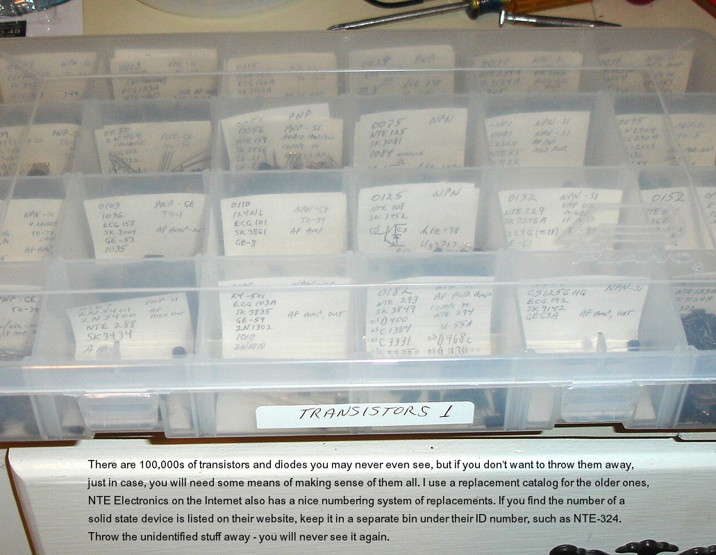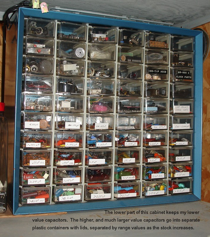 Ok, so you are getting boxes full of parts - now what? Well, if you are somewhat anal, like me, you get tired of searching for a particular size resistor or capacitor in a box of general parts. Depending upon your stash, it is time to get some parts bins. Start out with a few - maybe to separate the resistors from the capacitors, from the inductors, from the integrated circuits, etc. But eventually, you will need to separate by range of values; for example: 10's, 100's, 1000's, 10K's, 100K's, 1M's in values.