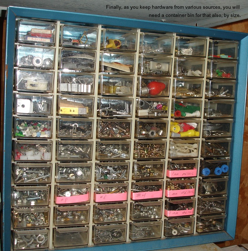 Surface mounted parts are generally not worth saving. They are a pain to remove, are generally hard to identify, and are a pain to resolder. Perhaps keep a small compartmented case with a few of the common ones, but leave the rest to the trash. Finally, every shop should keep a wide selection of hardware - machine screws & nuts, tap screws, washers, grommets, and the like (see the third photo below).