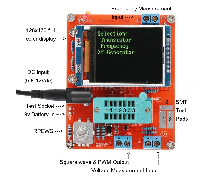 GM328 Transistor Tester & Frequency Generator: The GM328 Tester has most of the same capabilities as the earlier Mega328, but has several new capabilities. Most impressive - this tester includes frequency generation and a frequency counter. The GM328 Transistor Tester is sold as a kit and requires some experience in soldering skills as three of the parts are small surface mounted devices. The Tester will automatically detect NPN, PNP, and Field Effect Transistors (FET), diodes (including dual diode, zener diode and light emitting diode), triodes, thyristors, triacs, and SCRs, with automatic identification of the transistor pinout. The Tester detects power transistors with FET protection diodes built in. It also tests resistors (including adjustable potentiometers), capacitors, and inductors. This Tester can also generate a single square wave with 20 set frequencies from 1Hz to 2.0MHz, can measure frequencies from 1Hz to 2.9MHz with resolution to 0.001mHz, and can use an AC/DC power adapter (6.8-12Vdc, 30mA current).