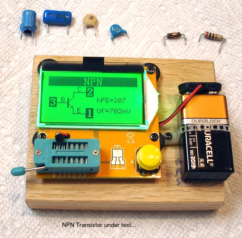 Mega328 LCR-T4 Transistor Tester: Actually, if you go online, the description of this unit is: Mega328 LCR-T4 ESR Transistor Tester Diode Triode Capacitance SCR Inductance. The Mega328 Transistor Tester, model LCR-T4, comes as a fully assembled board, but without the wood block shown in the picture. The wood block just makes the unit more stable by giving it some weight. It is often sold with an acrylic case, or the case may be purchased separately. The Tester will automatically detect NPN, PNP, and Field Effect Transistors (FET), diodes (including dual diode, zener diode and light emitting diode), triodes, thyristors, triacs, and SCRs, with automatic identification of the transistor pinout. It also tests resistors (including adjustable potentiometers), capacitors, and inductors. Documentation is here: Mega328 Transistor Tester.
